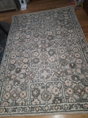 This 5’x7’ hand tufted area rug is really, really nice! It is well made and feels thick, making it look very expensive. I love the pretty textured detail of the floral design. It’s a beautiful sage green and almost pale pink color way with cream and beige tones to it. Important to note that there is no rubber backing to it, so we do experience some movement of it on our hardwood floors. Also, with it being hand tufted, there is some shedding.