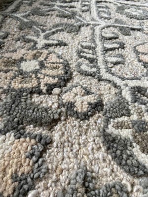 This is a beautiful, neutral rug that will go with almost any decor. It arrived rolled and packaged well. It was easy to open and it did not take long for the curled edge to flatten out with a little weight I put in the corners. It has no unpleasant odor and has not shed. It is a heavier rug so it doesn’t slide around and I did not need any rug grips underneath. Although hard to see in the pictures the rug has raised flowers and is about a 1/2” thick. I did notice the rug can be a bit itchy after sitting on it awhile.
