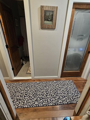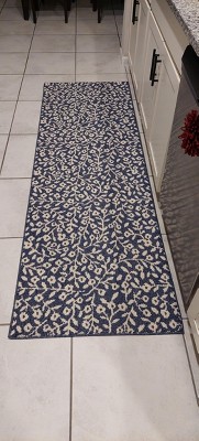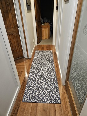 Dress up any space in your home in charming style with this Botanical Washable Runner Rug from Threshold™. This washable runner features an allover leaves pattern in an indigo hue with finished edges for a beautiful look that will coordinate easily with a variety of decor aesthetics. The olefin construction provides soft underfoot comfort, while latex backing helps to keep it in place. Plus, the low pile height makes it super easy to clean, making it highly versatile for high-traffic areas like your kitchen, living room or entryway.
