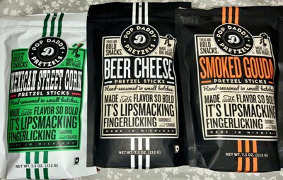 I found pop daddy pretzels at my local grocery store. I went back immediately the next day because I couldn’t get them off of my mind, I bought one bag of the smoked Gouda open them at the register ate them on my way home got home and immediately had to go right back to grab a bag of the Mexican street corn and a bag of the beer, cheese pretzels. I like to sit here and rotate between the three… my new life goal, try a bag of each flavor!