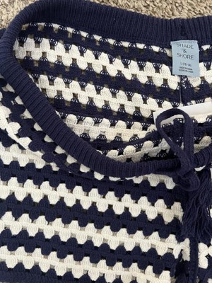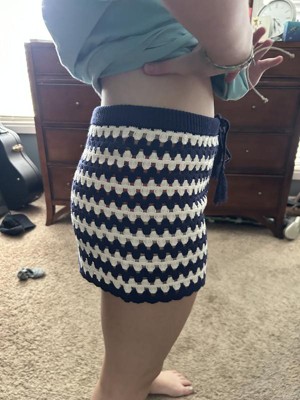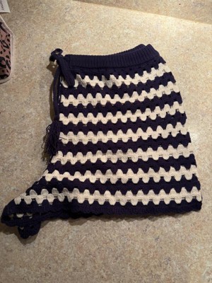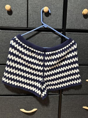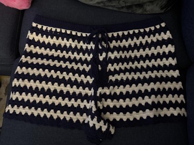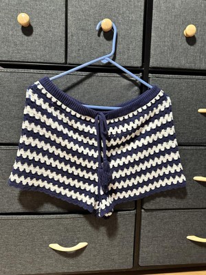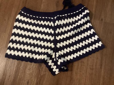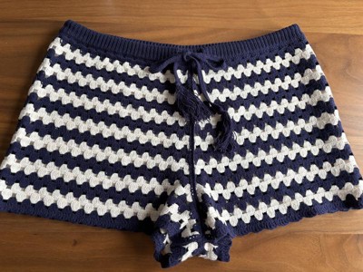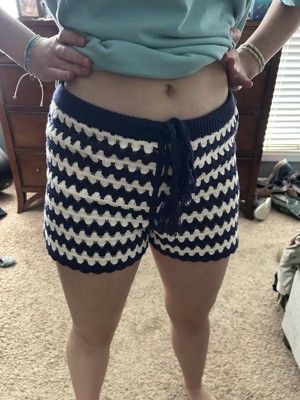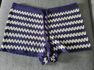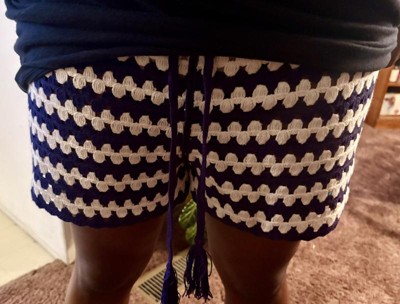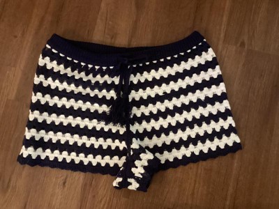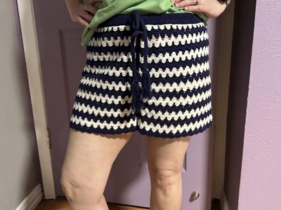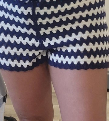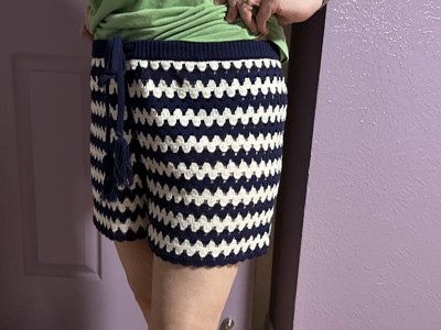 These shorts were not my favorite. They run small. I would need to size up 2 sizes to feel comfortable in them. I love navy and white summer clothing and thought they would be cute but the stripes are not cute at all once I put them on. The fabric/material was not too great either. For a crocheted item they were very flat with no stitch definition.