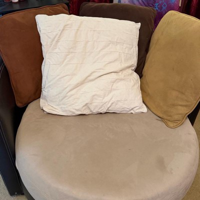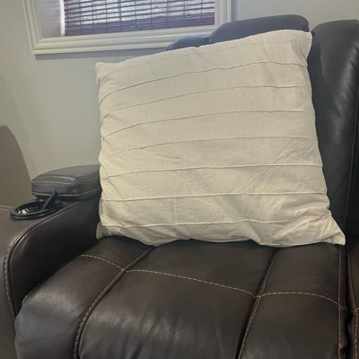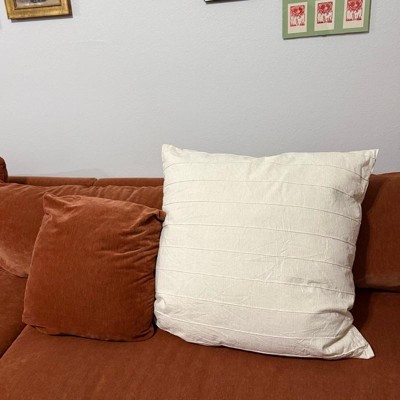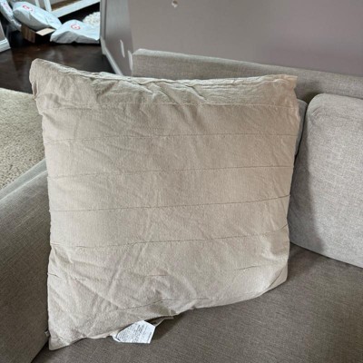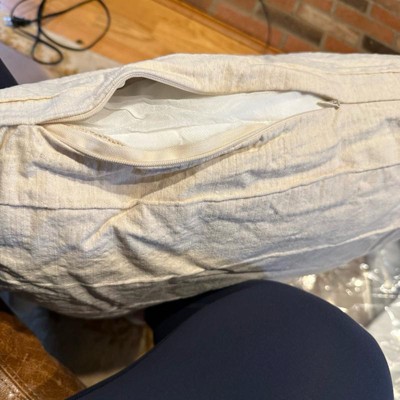 This tan striped large throw pillow by hearth and hand with magnolia has a very soft cover, but the material is not very supportive. It’s very squishy. It does have a removable cover, which is great for easy care and cleaning. I just need some thing a little more supportive for mine and my family’s preference