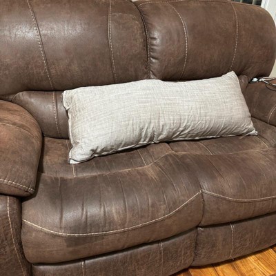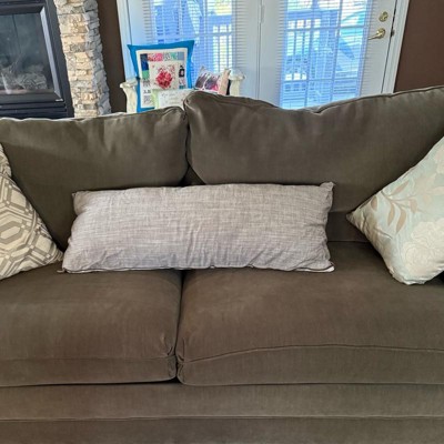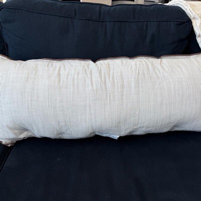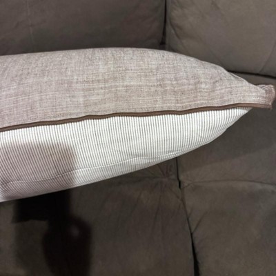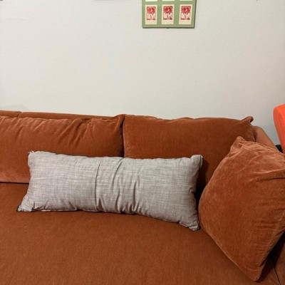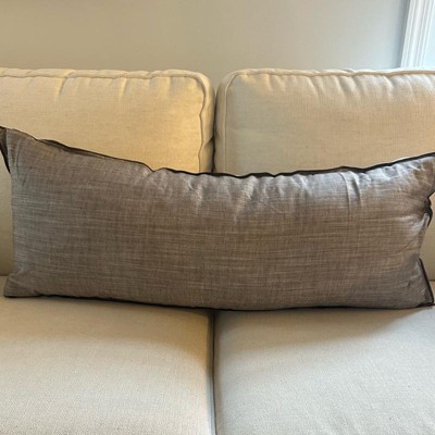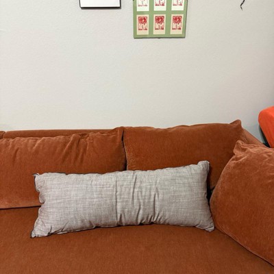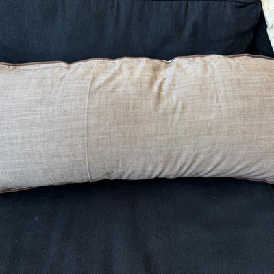 This is the hearth and hand with magnolia 14” x 36” oblong throw pillow in color brown. This throw pillow is perfect for a couch or a bed, it is squishy and comfortable. It can be reversible too as my picture shows. It brings a warm feeling to the room with the color and size. I do recommend this throw pillow.