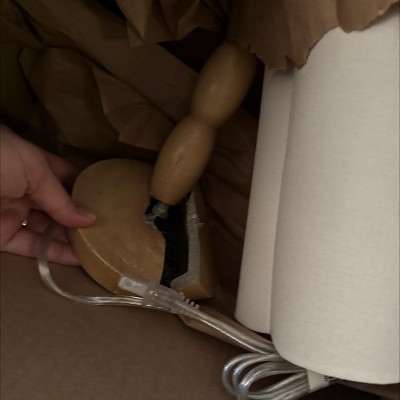 Cute little lamp! Simple turned wood in a rustic, natural wood finish. Neutral lamp shade adds some interest with scallop shape. Perfect small size for my nightstand or my kitchen. I actually cut the cord and use a battery operated light so one less item plugged into kitchen outlets!