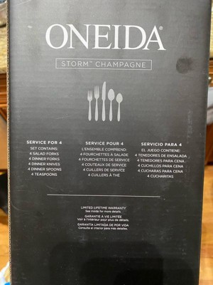 [This review was collected as part of a promotion.] Very pretty champagne colored silverware. This comes with service for 4, which is fine for my household. Oneida is a brand I am familiar with and has always held up well so I expect this service to do the same.