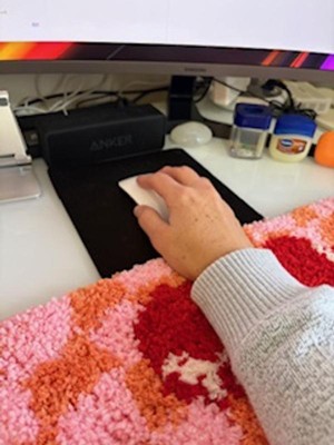 this is SO CUTE and totally my vibe! I love the pink and orange and the oversized cherry is adorable. the tufted material gives it this desk rug feel and is super soft. my only thing would be the size, I actually have it fully under my keyboard vs a wrist rest but it still looks cute!