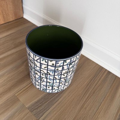 This is a super eyecatching patterned planter that could be used indoors or out to add a pop of blue color. It is well made and sturdy in ceramic. The interior is a dark green and there is a draining hole in the middle of the base. It fits well into contemporary or retro interiors and easily homes a real or faux plant.