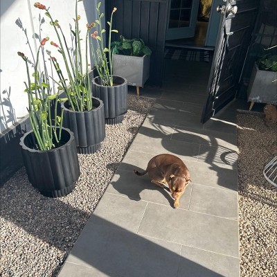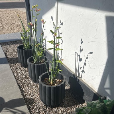 Absolutely love! The scalloped fluting style, durable plastic composite which the color is through and through so it won’t flake off like I purchased plastic with powder coating paint from target in the past and the paint flaked off. Looks adorable along our walkway with these tall red slipper plant that looks similar to a green bamboo with flowers and leaves. Many compliments my favorite collection. I hope they bring it back and include planters in much larger sizes.
