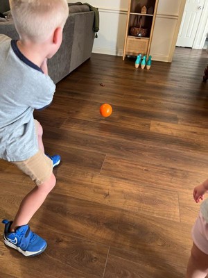 [This review was collected as part of a promotion.] This was a huge hit in our house (2 and 4 year old). They were able to set it up themselves since the pins are color coded. The pins themselves are heavy enough that a gust of wind won’t blow them over like most kids bowling sets, but the ball itself is relatively light so it doesn’t sound like our house is falling down when they use it (still heavy enough to knock the pins down though). The little organizer/carrier is clutch. All in all, very impressed with this set.