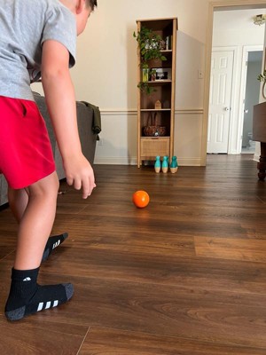 [This review was collected as part of a promotion.] This bowling set was super fun for my kids and nice and compact. The holder was super efficient with space and we could set up the pins in our hallways. This led to fun times. The quality was nice as well and wasn’t cheap plastic.