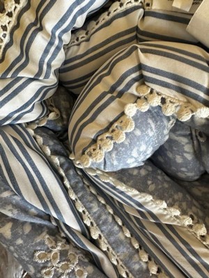 [This review was collected as part of a promotion.] This comforter is pretty thick and heavy it has a beautiful pattern and I really like the sham pillow cases and lace detail. It fits our queen nicely. It’s not very soft and I also dislike that the duvet doesn’t separate from the comforter so it’s harder to wash.