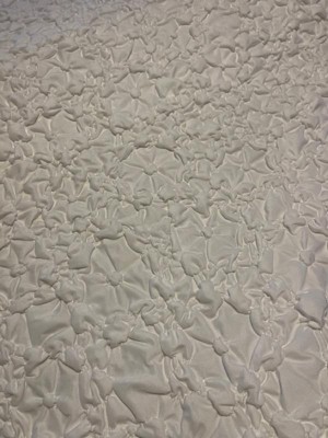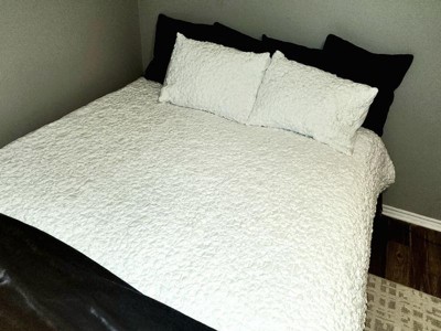 [This review was collected as part of a promotion.] This comforter set is a beautiful shade of white, very thick and soft! Fits perfectly on my bed and the design is gorgeous. It looks like it will last a long time. It is luxurious! The only thing negative I have to say is there were a lot of strings hanging off that I had to trim. I appreciate that I got this sent to me!
