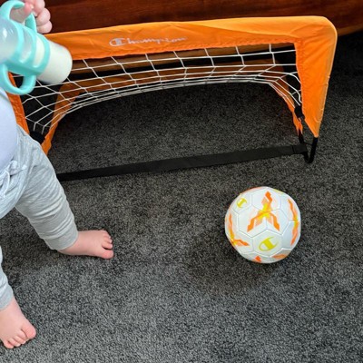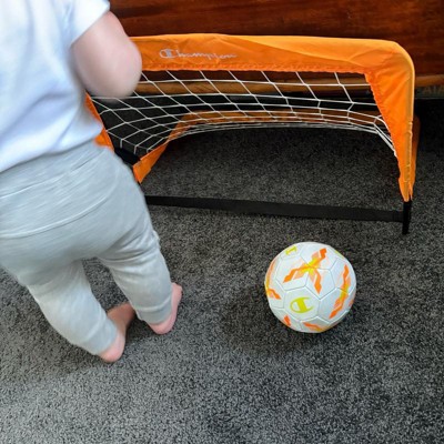 This is perfect for toddlers or beginners. The ball is small and easy to kick. This does fold down (little harder than I thought) and it comes with a bag to store it in and also easy to bring places. I had this set up in my living room for my grandchild to play and it was perfect until we can play outside. It kept him entertained and lots of laughs. Ball quality is ok. The price point was fair and would purchase again.