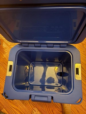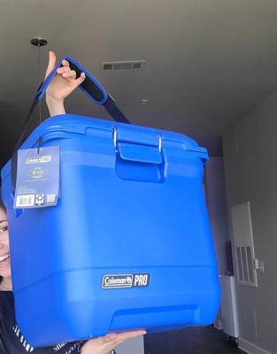 The Coleman pro cooler is very sturdy and durable. The color is a pretty vibrant blue. I like that the cooler is longer in dept vs width making it easier to carry. Inside the cooler I was able to fit a family sized ketchup, mustard, sausages, hot dog buns, a large simply made raspberry lemonade and 8 frozen lobster tails. Yes that’s correct 8 tails!!! I love this cooler and can’t wait for the summer to be here already. I received an incentive to write this review.