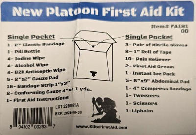 [This review was collected as part of a promotion.] The Platoon First Aid Kit by Elite First Aid, Inc offers a thorough variety of bandages, antiseptic wipes, instant ice pack, tweezers, scissors and more to help take care of you or your family. The carrying case will easily attach to a belt or a pack with the included straps.
