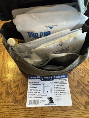 [This review was collected as part of a promotion.] This kit is housed in a small tactical/army-style kit pack that has 2 options for attachment to a belt or military style backpack (MOLLE compatible). It has a solid amount of gear within it for multiple levels of first aid care, from shallow to deep. There is a smaller pocket inside that can separate out pills and tools vs the bandages in the bigger pocket behind it, for ease of quick, emergency time access. The gear list attached is handy to keep, for restocking purposes.