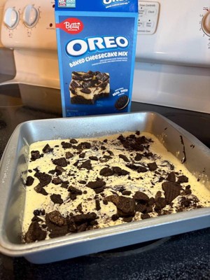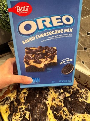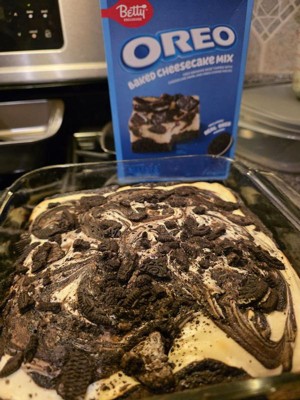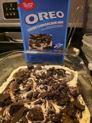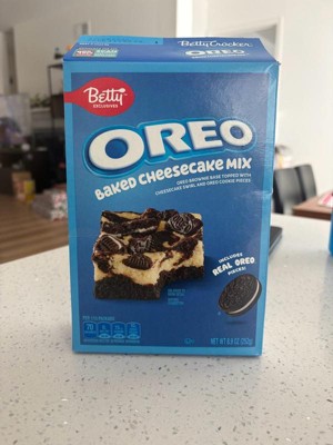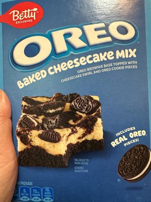 The OREO Cookie taste you love comes in this Betty Exclusives OREO Baked Cheesecake Mix. Easily prepare an irresistible dessert with an OREO brownie base topped with cheesecake swirl and OREO Cookie Pieces. All the dry ingredients that go into making this dessert are inside the box. Just add butter or margarine, water, eggs, and softened cream cheese according to the package directions, then bake. You can also use this baking mix to make your own creations such as cheesecake brownie bites or mini cheesecakes with real OREO Cookie Pieces sprinkled on top. Use this OREO baking mix to whip up a party treat, an after dinner dessert, or a sweet anytime snack for the family. Every Betty Exclusives offering is backed by the Betty Crocker promise of great taste, quality, and convenience. 15 servings per container.