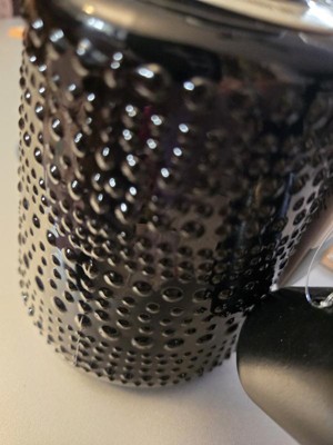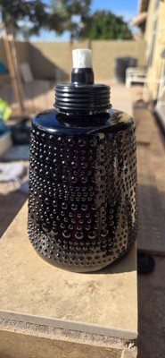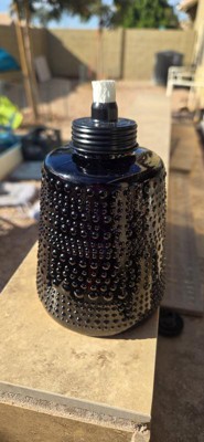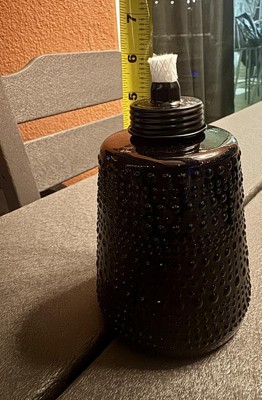 [This review was collected as part of a promotion.] This is one of the better table torches I have used. The main reason is because it is anti slip, it has beads on the glass surface so it doesn't slip especially on fill up or refill and the liquid spills out. Also it's a triangular shape so it won't tip over, it is 4" in diameter. The total hieight with the wick is 6 making it compact and easy to travel with to a campsite. I like dark glass because it doesn't show the liquid and you can't see it from the outside. Also the color is very likable because it blends in with the color of most modern patio furniture. The only suggestion I have is that cap can get lost as it is not attached to the unit with anything.