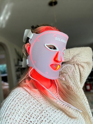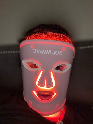 Solawave I was excited to try this 4 light therapy mask. I'm in my mid 40's and have been noticing changes in my skin. The package arrived in a light pink aesthetic box. Inside was the mask, a remote control, a charger cord and a carry bag for storage. The mask is soft and extremely flexible. The remote takes a couple of hours to charge and holds a charge for at least 20 uses. The mask straps on with two Velcro straps and holds securely to the head. This allows you to multitask hands free while enjoying the treatment. There are soft eye cushions that protect your eyes while using the mask. I've used the mask 3 times a week for the past month and I am very pleased with the ease of use, relaxing treatment and the results. Each treatment only takes 3 minutes which is amazing. I really enjoy using the mask, it's like being in a spa at home. I've noticed that my skin is tighter & firmer, especially in the areas where wrinkles were at. I've also noticed a glow from the inside out that many people have complimented me on. I have a couple of sun spots on my forehead that I am still hoping to see improvement in. This mask gets a 10/10 for me. I will keep using it regularly especially because it's so relaxing. I received this product as part of an educational program.