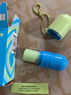 [This review was collected as part of a promotion.] Just the perfect size to put on my keychain made it look extra cute and the texture of the actual balm was just right it was minty but not to strong just perfect