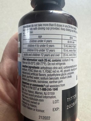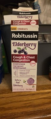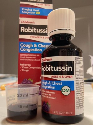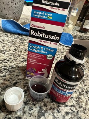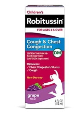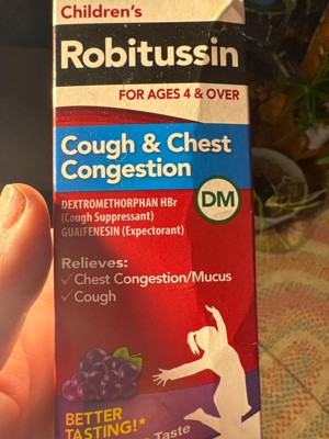 Children's Robitussin Cough & Chest Congestion DM is a cough medicine that relieves your child’s coughs and the symptoms that often come with them, all in a tasty grape flavor. This children's cough syrup goes down quickly and provides cough and cold relief fast so your family can get on with your day. Give this medicine to your child every four hours while symptoms persist. Intended for ages four and up, this cough and chest congestion medicine requires a different dosage depending on your child's age. Children 4 to under 6 years may take 5 mL every 4 hours, children 6 to under 12 years may take 10 mL every 4 hours and adults and children 12 years and over may take 20 mL every 4 hours, do not take more than 6 doses in any 24-hour measure only with dosing cup provided keep dosing cup with product mL equals milliliter. Children under 4 years do not use. Each dose of this chest congestion and cough medicine controls and temporarily relieves coughs while also thinning and loosening mucus to provide chest congestion relief. Stow this Robitussin Cough Suppressant in your bag either in your home or on the go. Formulated to provide multi symptom cold relief and cough relief without slowing kids down, this medicine keeps your child's symptoms at bay. Delivering cough relief for more than 70 years, Robitussin has the product you need to treat your specific cough, cold, sore throat or flu symptoms for day and night relief.