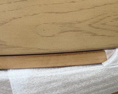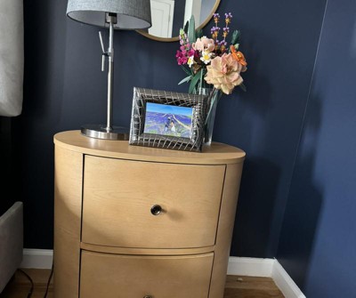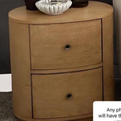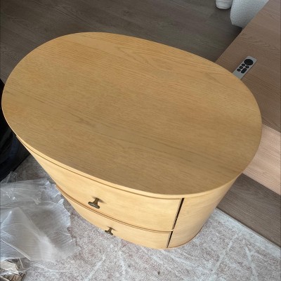 This nightstand arrived on time and packaged extremely well. The oval shape is perfect. The color is perfect and the drawers are work well.