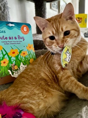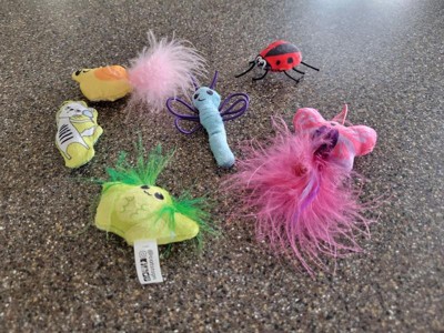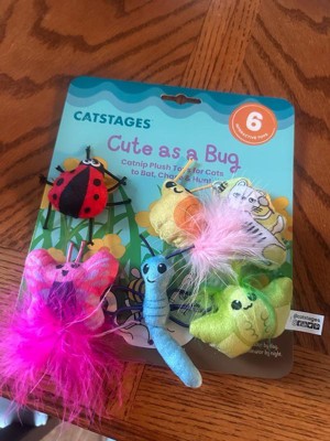 [This review was collected as part of a promotion.] My kitties love to play with creepy crawly bugs, but these are totally adorable!!! They are the perfect size to bat around. You get 6 soft and cute bugs in a package, filled with cat nip. My cats go nuts for their nip bugs when it's play time. These are made of quality materials that are soft and crinkle. There's even 3 bugs with feathers that my cats seem to think they need to kill. It's a hoot watching my 2 furry friends play with these. It's a great way for your cat to have some nippy fun and get some exercise in between nap time.