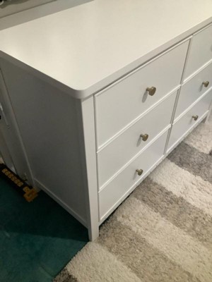 [This review was collected as part of a promotion.] This is a very nice dresser. It comes in many, many pieces, assembly most definitely needed. It took me and my husband about an hour and a half to put it together. The frame took some time, yes it comes with directions but they weren’t the easiest to understand. Once the frame was done, the rest, the drawers were a piece of cake to assemble. It has a nice clean, modern look. I would say it’s off white, not true white with gold tone knobs. It will go with just about any decor, perfect for a nursery, kids room, or any room. It’s a decent size and does take up space. The 6 drawers is nice, lots of space. The drawers are not the biggest but they do hold a lot. It has a safety feature where only one drawer can be opened at a time, which is nice but I prefer to be able to open more than one at a time, as when I put away laundry I would put things in different drawers at the same time. It’s durable, heavy, good quality and most of it seems strong and heavy duty. I say most of it because the drawer bottoms are thin, but they do come with a piece of wood to suppose them from the bottom. It comes with all the things you need to secure it to the wall or wherever so it doesn’t tip over, safety again, which is good. Overall a very nice dresser, it just needs better instructions.