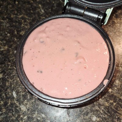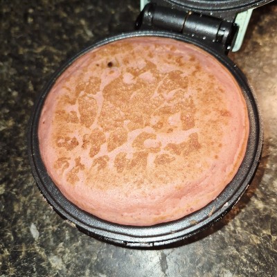 These pancakes turn out a very nice pink. I couldn't quite capture the color in my photos, but they are definitely pink. The powdered mix doesn't look pink, but the batter and pancakes do. The finished pancakes were delicious, even without the addition of toppings. But, they were also good with toppings! (We used hickory syrup and whipped cream, but there are plenty of good options.) The chocolate chips do sink to the bottom of the batter, so I tried to scoop some into each pancake instead of just pouring the batter into my little pancake griddle device. We made the whole box, and had some extra pancakes. So we put parchment paper between the "leftovers," and stacked them in a freezer-safe container. Then we froze them. A few days later, we popped the frozen pancakes into our toaster, heated them, and ... it worked! The pancakes were, again, delicious.