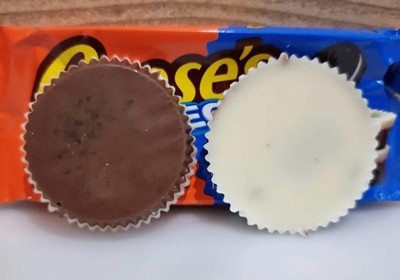 These are honestly not too bad. Would be better with less white on top. They are half chocolate half white with peanut butter and the oreo cookie pieces inside. I saw them and love both individually. Id give these a 6/10. Id eat them if they were there but im not sure if i would purchase them in the future.