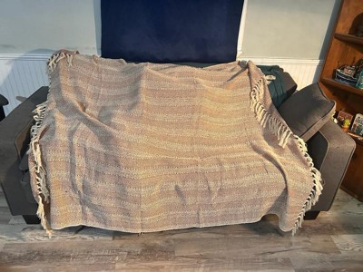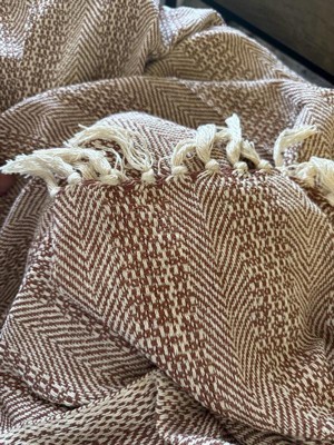 [This review was collected as part of a promotion.] Very cute and large throw, has a good weight to it, and love that it's mostly cotton, so you won't get sweaty. The color is more rust brown and cream, and the tassels are cute. I don't like that's it's dry clean only for some reason, machine washable would've been better imo,I'm not taking a throw to the dry cleaners!