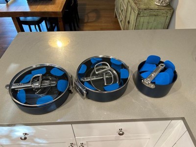 [This review was collected as part of a promotion.] I am so impressed with these! Each pot, pan, and lid has foldable handles, allowing them to be stacked for compact storage. However, they seem to be incredibly durable. The hinges lock securely into place, with a latch underneath the handles to release them. Beyond the innovative handles, each pot and pan performed exceptionally well, both on the stove and in the oven. They cooked evenly and nothing has stuck on the surface. They’re easy to handwash with a soft sponge. They are also a beautiful blue color that wouldn’t clash with most kitchens’ decor.