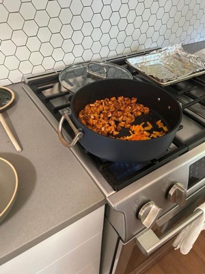 [This review was collected as part of a promotion.] I am obsessed with these pans! These are by far the best pans I've ever owned. They are heavy and feel like they'll last me years. They cook evenly and quickly. They're super easy to clean. Food comes right off. I think the foldable handles are so innovative and save so much space. I think the dark blue color is so pretty. Looks great in my grey and checkered kitchen.