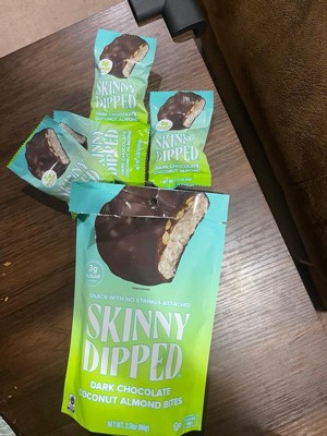 [This review was collected as part of a promotion.] If you like almond joys, you'll love the Skinny Dipped dark chocolate coconut almond bites. I will start off and say that I'm really not a fan of dark chocolate, but the sweetness of the coconut really balances it out and makes these enjoyable. If you're looking for a small, 3 bite, candy fix, these are the perfect size. I also love that they come individually wrapped, so I can toss a couple in my bag to enjoy on the go.