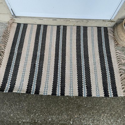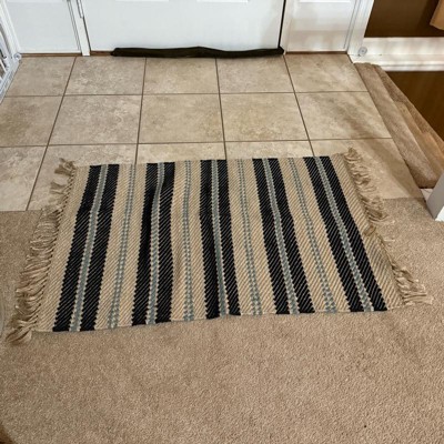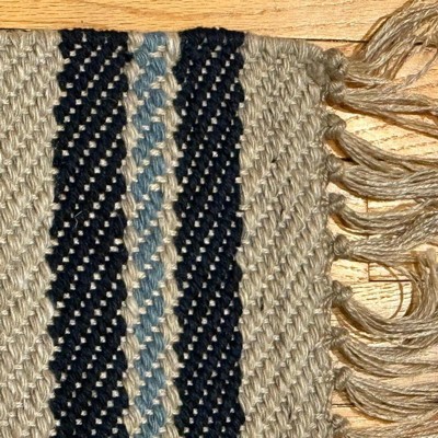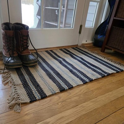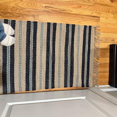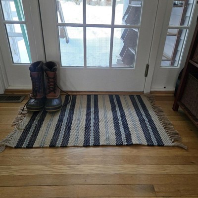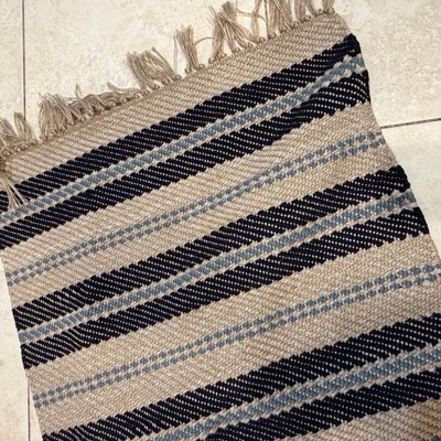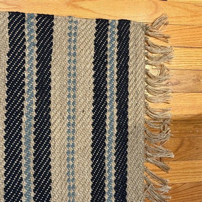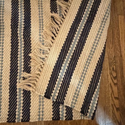 This tan indoor rug has navy and light blue stripes that are handwoven with fringe on both wnds. There is no rubber backing so i need to put one of those rubber pads under it on my hardwood floor sonit doesnt slide around. I dont think i can put it in the washing machine since it states you can only spot wash stains.