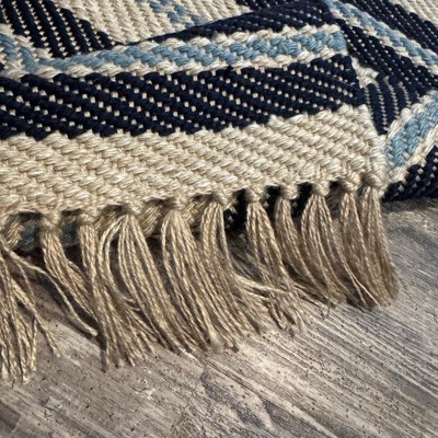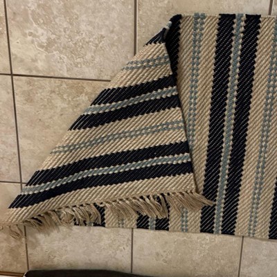 Add timeless charm to your space with this Striped Twill Accent Rug from Threshold™ designed with Studio McGee. This rectangular handwoven accent rug features blue stripes on a tan backdrop, creating a fresh and inviting look for your entryway, kitchen or bathroom. Crafted from 100% polyester with a flat pile height, this rug offers easy upkeep and comfortable use. The fringed ends add a decorative finishing touch, making it perfect for layering or defining smaller spaces indoors.