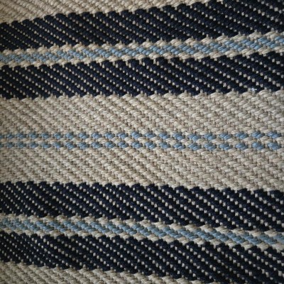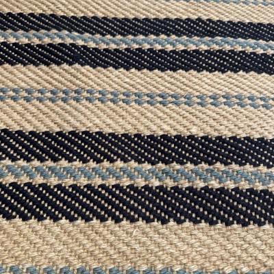 A: The rug features a striped twill design with blue stripes on a tan backdrop.
