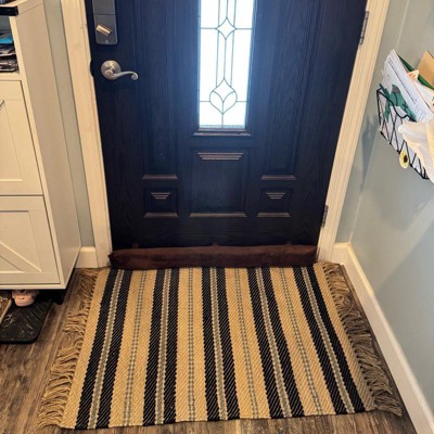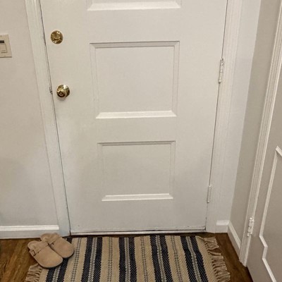I chose this rug because I liked the colors. The stripe is classic navy and isn’t too busy. When it came, I was pleasantly surprised. It is much softer than I expected. It wasn’t scratchy and the fringe wasn’t stiff. It looked nice in front of my door and complimented the space. The price was great, making it an affordable way to spruce up your entryway.