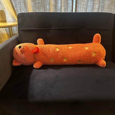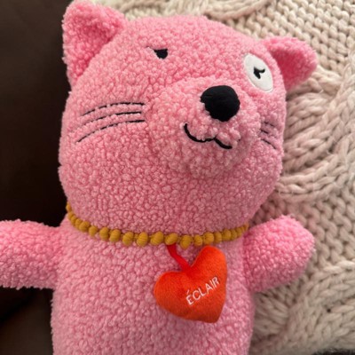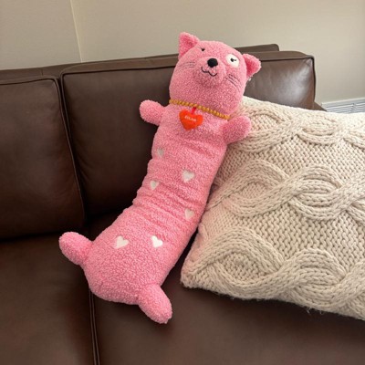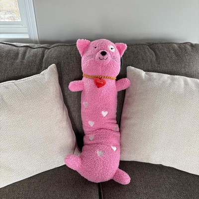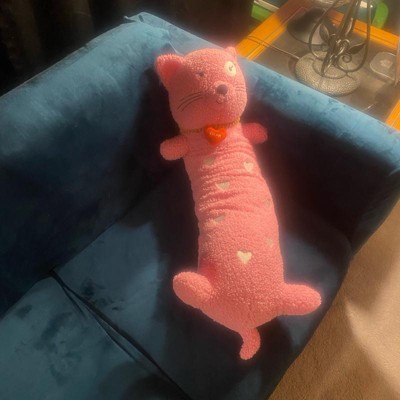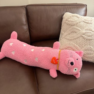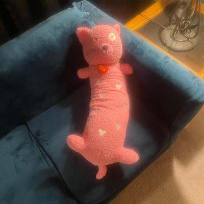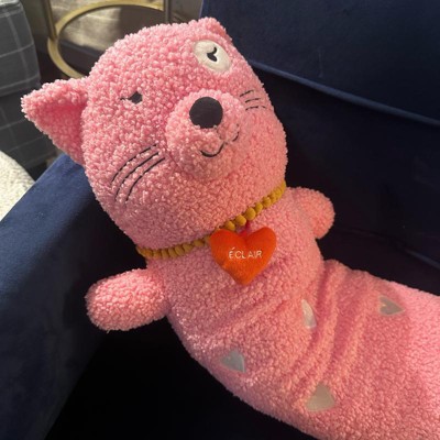 This very long weighted, plush throw pink cat by pillow for is just the cutest thing ever. The name tag on the cat says eclair, and it is so soft and it is perfect for any kid who likes to snuggle with a full body pillow the heart on the stomach, the heart name tag the detail of the collar is so perfect.