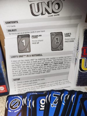 [This review was collected as part of a promotion.] Liars UNO was a fun game and we played with the kids. We all know UNO very well so it was tricky to remember to play the liars cards face down but it added a fun part to the game. The 0 cards were also new and unique. All in all my kids loved the twist and there were lots of laughs.
