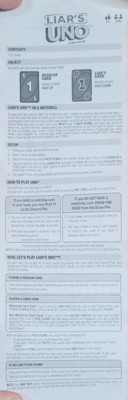 [This review was collected as part of a promotion.] The uno cards are as expected with being off good quality material. The instructions are really easy to follow, and being clear about the new symbols and rules to usual uno. For us it took a little bit to get used to the rules, and often forgetting what card was actually meant to be in play, however, after a couple of rounds we were having fun and found our rhythm. The main concept about lying meant there were a lot of laughs with how well or bad everyone was at lying, and a few debates about the new rules, all expected with uno. This is definitely a different version of usual game, so it is exciting. Easy to play for 7years plus. Great game to have for travel and on the go to occupy time.
