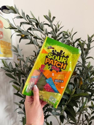 SOUR PATCH KIDS Soft & Chewy Candy Strips pack the classic SOUR THEN SWEET fruit flavors you love into ribbon-like soft candy belts. Designed for biting, tearing, and twisting, these sour candy strips are a fun, sweet treat that’s SOUR. SWEET. GONE. Each bag contains sour candy belts in signature assorted flavors that satisfy your taste buds, including Blue Raspberry, Redberry, Lemon, Orange, and Lime. Add a fun and flexible twist to your sour gummy candy experience with these bendable sour belts with the same chewy texture and bold punch that make the original SOUR PATCH KIDS sour gummies a favorite. These fruit flavored candy strips are wonderful for snacking at home or on the go. Keep SOUR PATCH KIDS Strips on hand for quick gummy snacks or as party favors for Halloween, Valentine's Day, and birthdays. Each package of bagged candy is just the right size for tossing in backpacks, lunchboxes, and purses for on the go snacks, or for including with holiday gifts. These gummy candies also make great movie theater candy to enjoy during your favorite flick. Whether you’re serving SOUR PATCH KIDS candy strips as holiday candy during festive celebrations or savoring the chewy snacks solo, these sour candies turn any moment into a flavorful adventure.