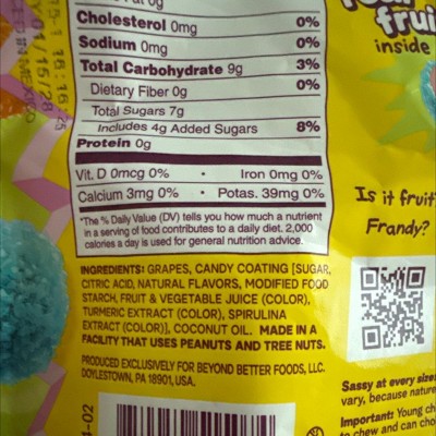 These were fantastic when I first opened the bag. The crushed candy on the grapes reminded my husband and me of the Dum•Dums lollipops’ flavors.. very childhood reminiscent. Very crunchy, good grapes, great flavor… until I got to the bottom of the bag. The grapes toward the bottom were old and squishy and seemed to have a very thick coating of a wax-like substance. Could very well be a thick layer of coconut oil on the grapes (very chewy ‘cold coconut oil’ texture) and I was NOT a fan at this point. Kinda disappointed. I will give them another chance before writing them off.