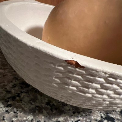 I have mixed feelings about this bowl. It is sturdy and heavy weight. The quality of the bowl itself is amazing. The woven texture could’ve been better though. I found so many spots where it’s more flat, just someone pushed on it after doing the design and where there are “seams” almost. As a decorative piece it is great if you are not viewing it up close
