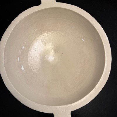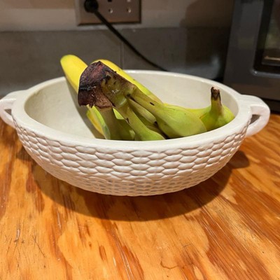 Cute well made bowl - the texture looks authentic-its 12 inches wide - wish it was a tad wider but it works. Nice ivory warm white- not chaulky, a bit of muted shine.