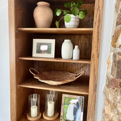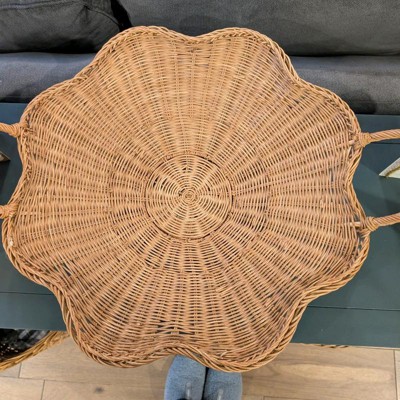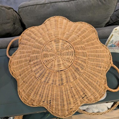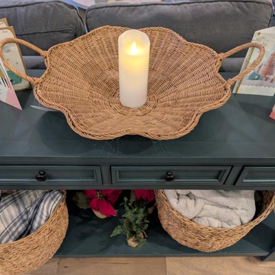 I purchased this online because I loved the scallop shape. The woven design and scalloped shape give it a unique, elevated look that feels both cozy and stylish. It’s well made and sturdy—not flimsy at all—and the handles make it easy to move around. I’ve used it as a coffee table centerpiece with candles, on a console table for décor, and even for light serving. It’s the perfect size and works with so many styles, from modern farmhouse to coastal or neutral décor.