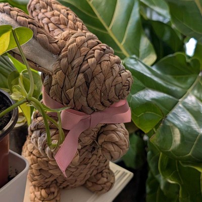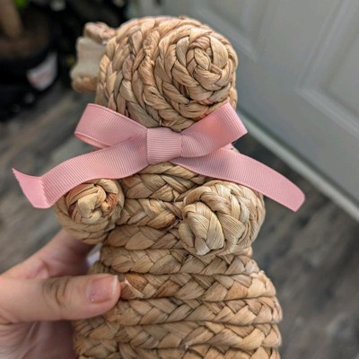 This Woven Standing Easter Bunny is great for the holiday. It is 8.5 Inches in hight and had ears behind its head. Its ears are a lighter color on the inside. The end of the the straw rope ends at the tip of its nose. It’s has an adorable pink bow on the front of its chest. It’s head is looking to the side.