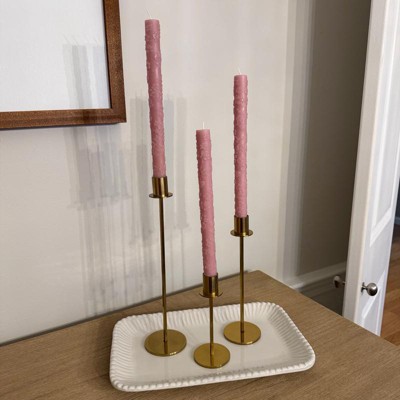 Accentuate the look and feel of your home with this Set of 3 Minimal Gold Metal Taper Candle Holders from Threshold™. These candle holders are made of metal and feature a gold-tone finish for a touch of glam. Designed with a circular base, these taper candle holders can be placed on a shelf, tabletop or any other flat surface.