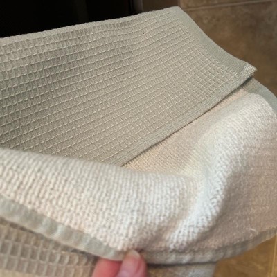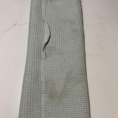 I really like the look and the feel of these two kitchen towels. They are really thick and the waffle texture is really nice. The colors are super nice for spring like a slate blue and a soft green. They feel like really high-quality in my kitchen. They also have an inner loop for hanging them if needed .