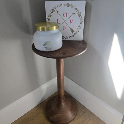I purchased this decorative side table online for my home. This cute little wooden table is advertised as a "plant" table, but really it can hold anything small that you want to keep close by. For now, I have it in the corner of my Family Room with some Valentine's Day decorations: a scented candle and a wooden LOVE sign. The table is not very large. It is less than 2 feet tall and about one foot wide. The wood has a nice rich tone to it and looks more expensive than it actually is. The color is prettier in peraon than it looks in the online photos. For the price, i think the quality is great and is am happy with this purchase.